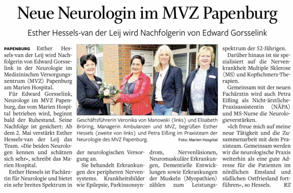 Zum 2. Mai tritt Esther Hessels-van der Leij die Nachfolge von Edward Gorsselink als Fachärztin für Neurologie am Marien-Hospital in Papenburg an ... weiterlesen auf noz.de